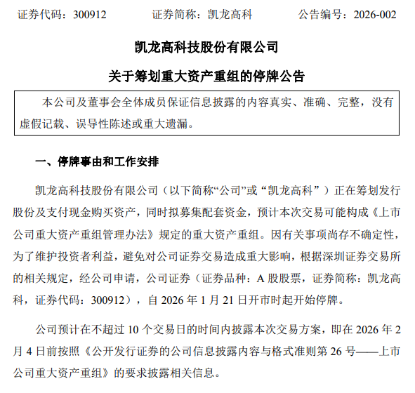 凯龙高科1月20日晚公告,公司正在筹划发行股份及支付现金购买资产,同时拟募集配套资金,预计本次交易构成重大资产重组。公司股票自1月21日起停牌,预计停牌时间不超过10个交易日。