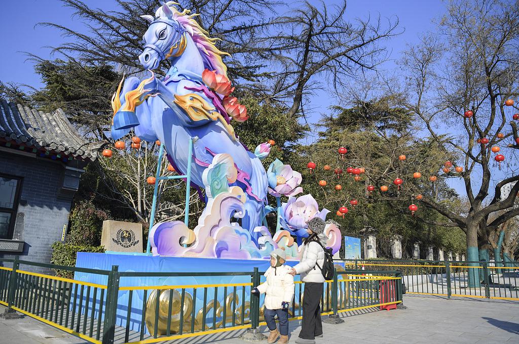 2026年1月22日,山东省济南市第45届天下第一泉迎春花灯会安装工作正有序进行。图为游客观赏马元素花灯。 中新社记者 张勇 摄 图源:视觉中国