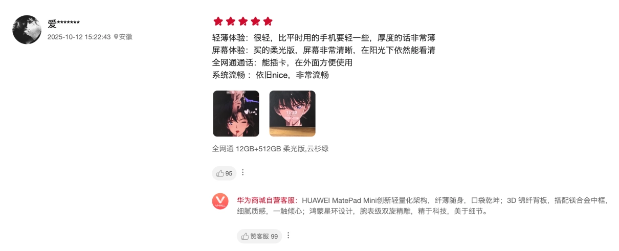 从天猫、京东的销量榜单,到线下门店的排队体验,再到网络上“怎么都迷你”、“通勤神器”的如潮好评,市场已经给出了最真实的反馈。华为 MatePad Mini 不仅丰富行业在高端小尺寸平板领域的选择,更以极具优势的产品力体验,精准满足了用户通勤临时办公、旅途阅读、休闲娱乐等“随时待用”的场景需求,也为整个平板行业树立了新的标杆。