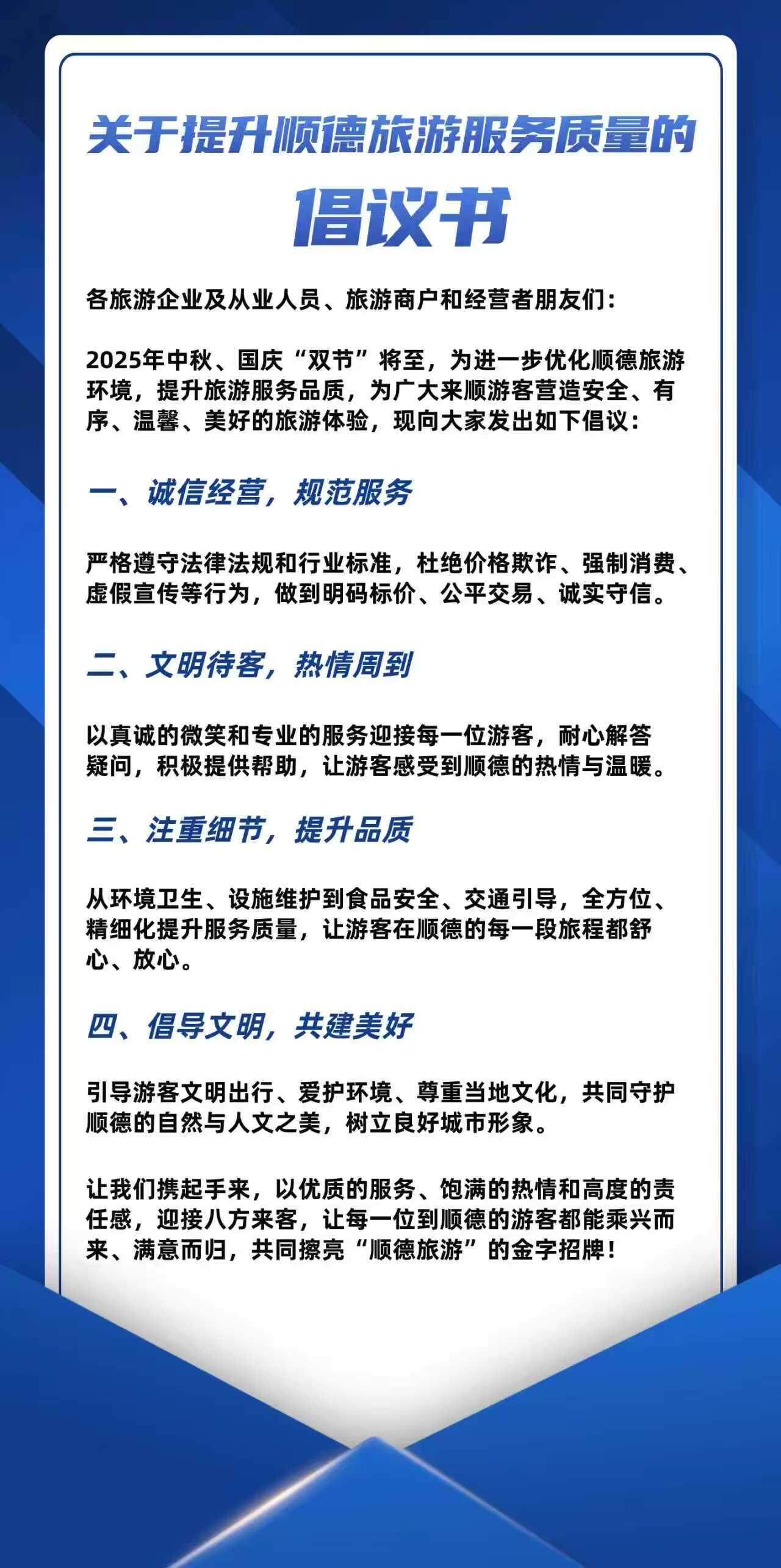 发布会当天,顺德还同步发布《关于提升顺德旅游服务质量的倡议书》,号召旅游企业及从业者诚信经营、文明待客,从食品安全、环境卫生、交通引导等细节入手,为游客营造安全、温馨的旅游环境。